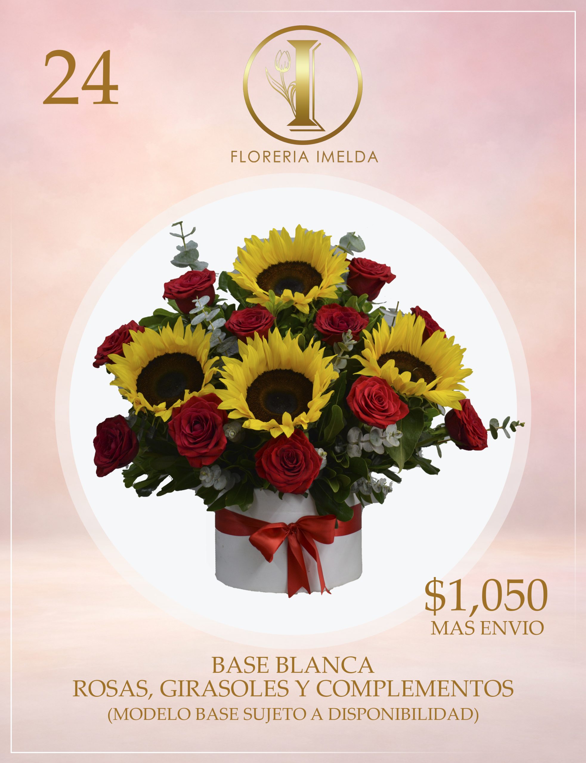 BASE BLANCA ROSAS, GIRASOLES Y COMPLEMENTOS (MODELO BASE Y COMPLEMENTOS SUJETO A DISPONIBILIDAD)