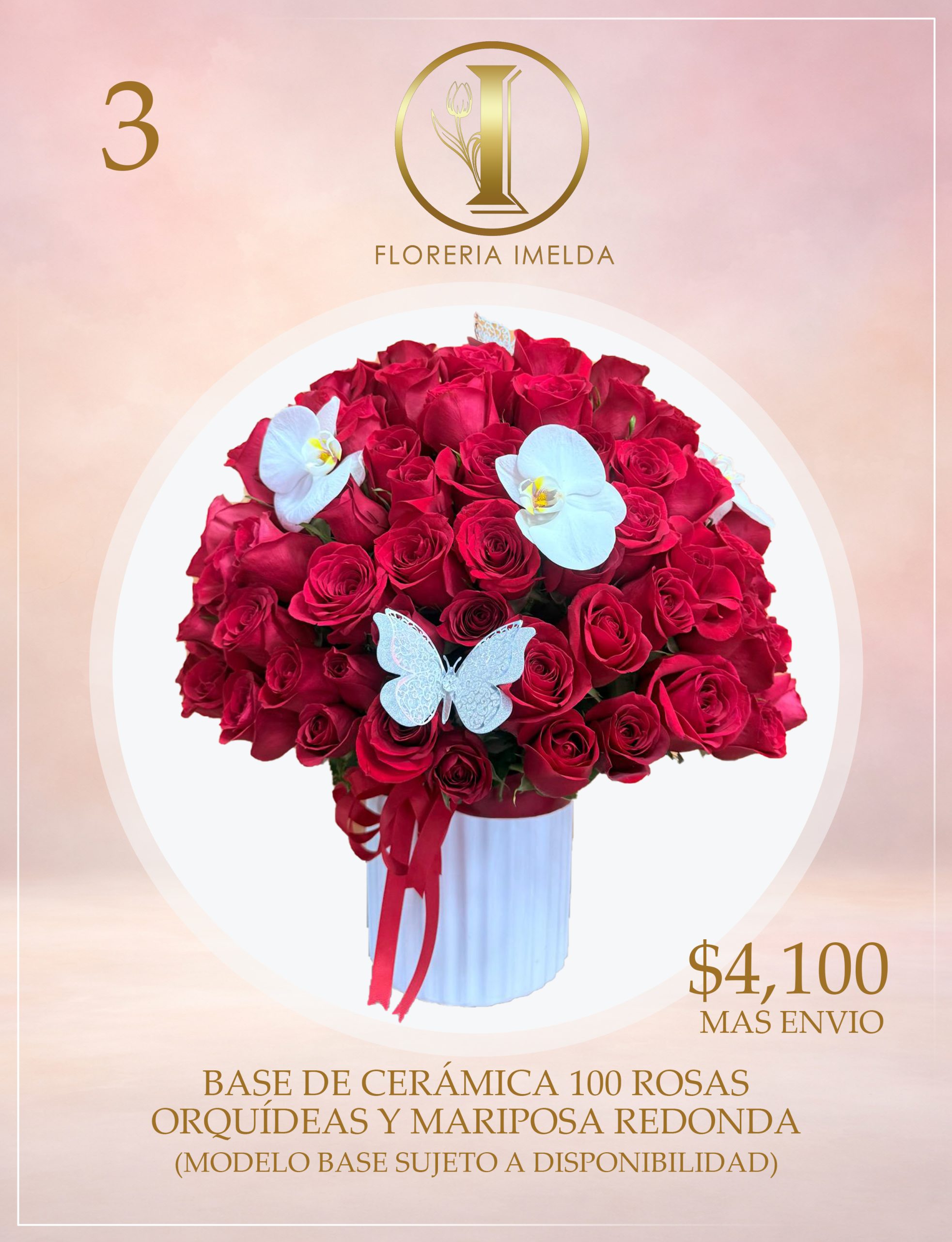BASE CERAMICA 100 ROSAS ORQUIDEAS Y MARIPOSA (MODELO DE BASE Y COMPLEMENTOS SUJETO A DISPONIBILIDAD)