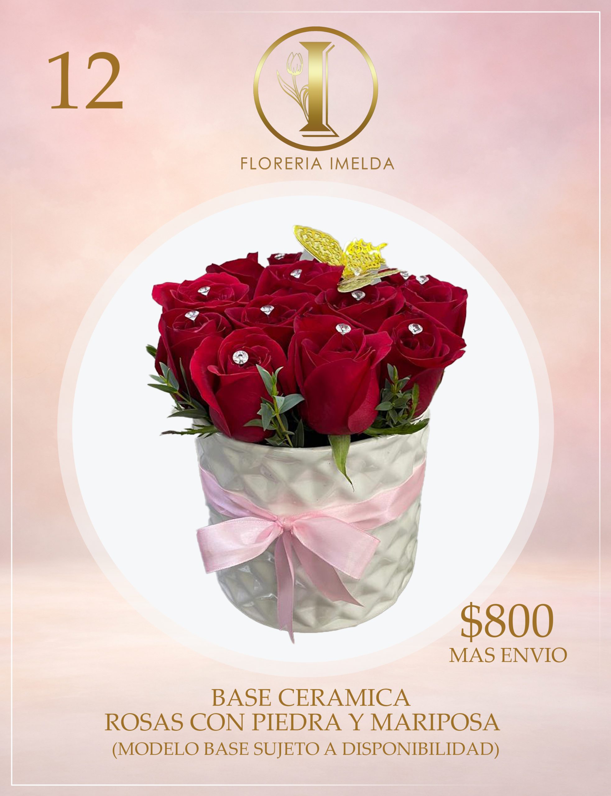 BASE CERAMICA, ROSAS CON PIEDRA Y MARIPOSA (MODELO BASE Y COMPLEMENTOS SUJETO A DISPONIBILIDAD)