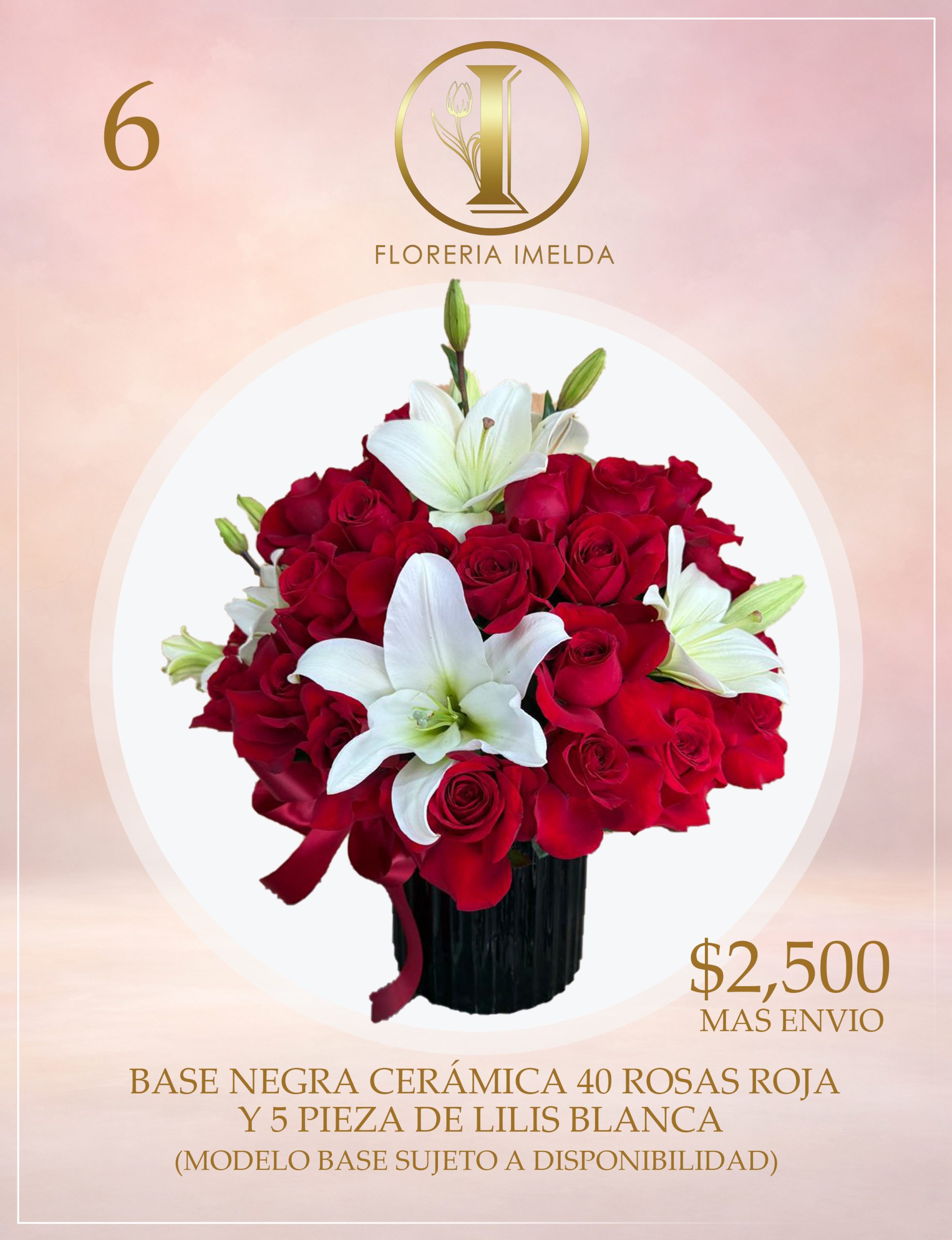 BASE NEGRA CERAMICA 40 ROSAS ROJA Y 5 PZAS LILIS BLANCO (MODELO BASE Y COMPLEMENTOS SUJETO A DISPONIBILIDAD)