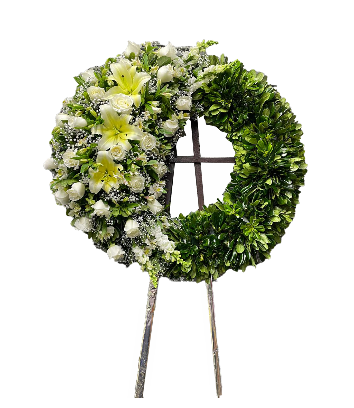 Flores blancas y complementos, mitad de follaje (complementos pueden variar a disponibilidad)