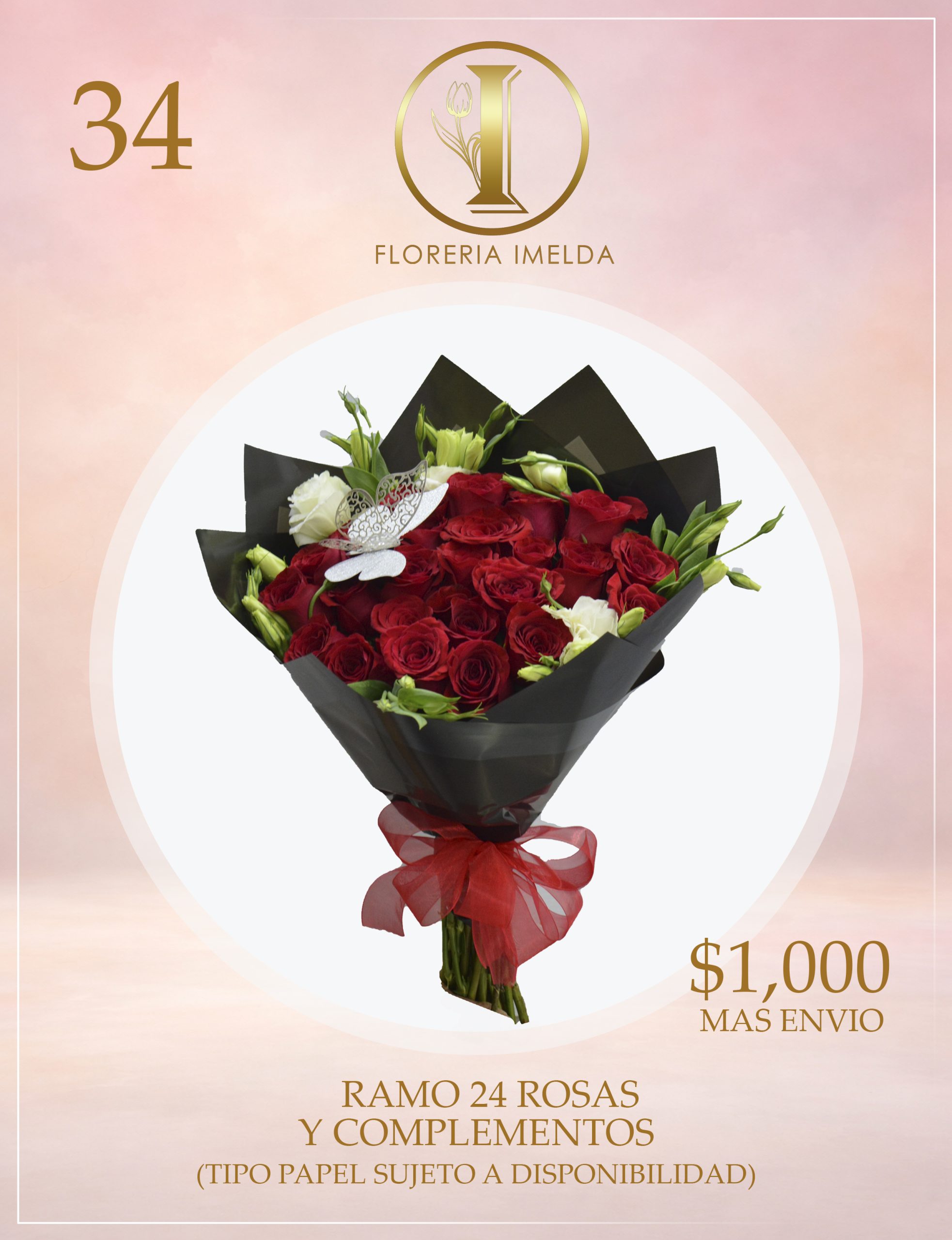 RAMO 24 ROSAS Y COMPLEMENTOS (TIPO DE PAPEL Y COMPLEMENTOS SUJETO A DISPONIBILIDAD)