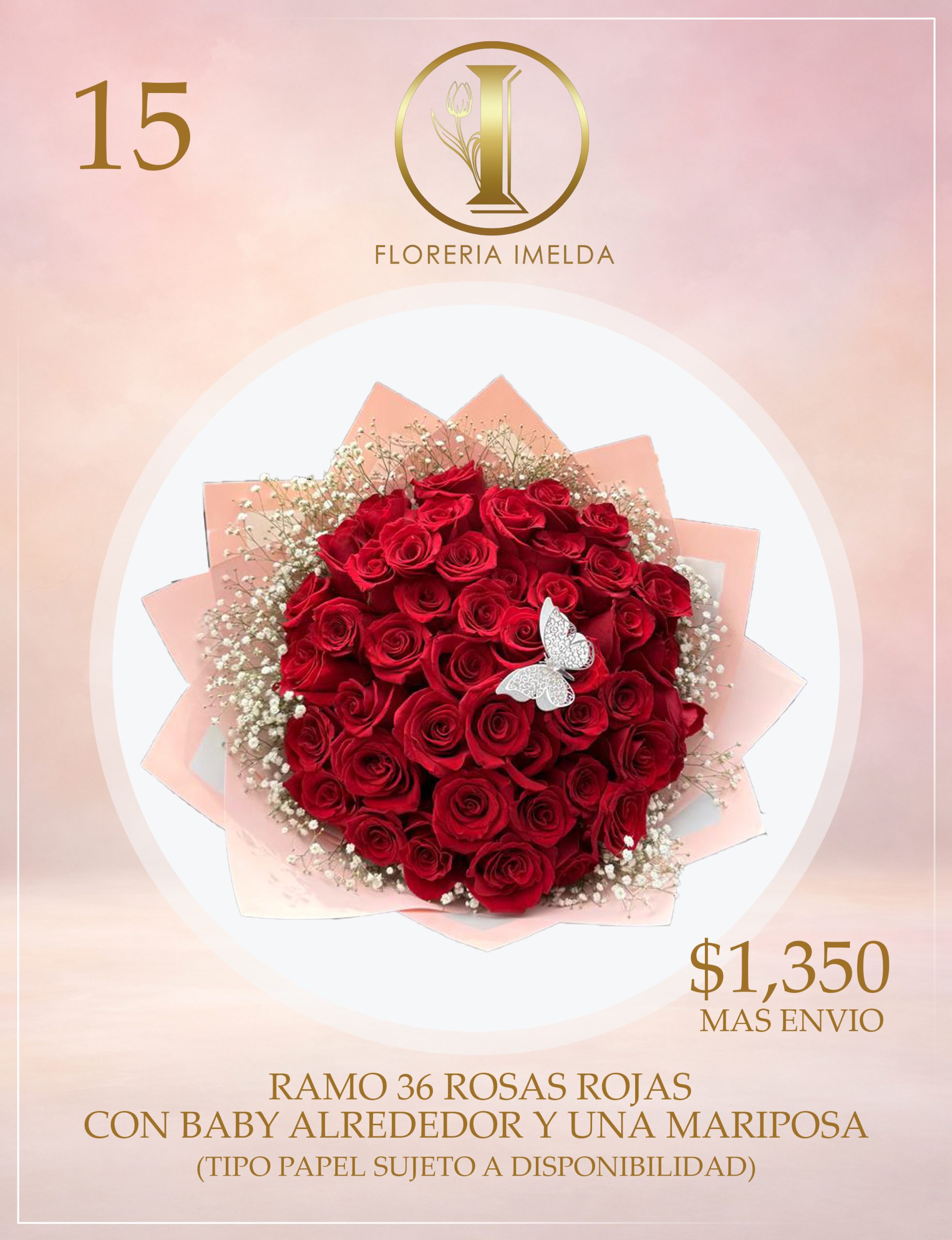 RAMO 36 ROSAS ROJAS CON BABY ALREDEDOR Y MARIPOSA (TIPO DE PAPEL Y COMPLEMENTOS SUJETO A DISPONIBILIDAD)