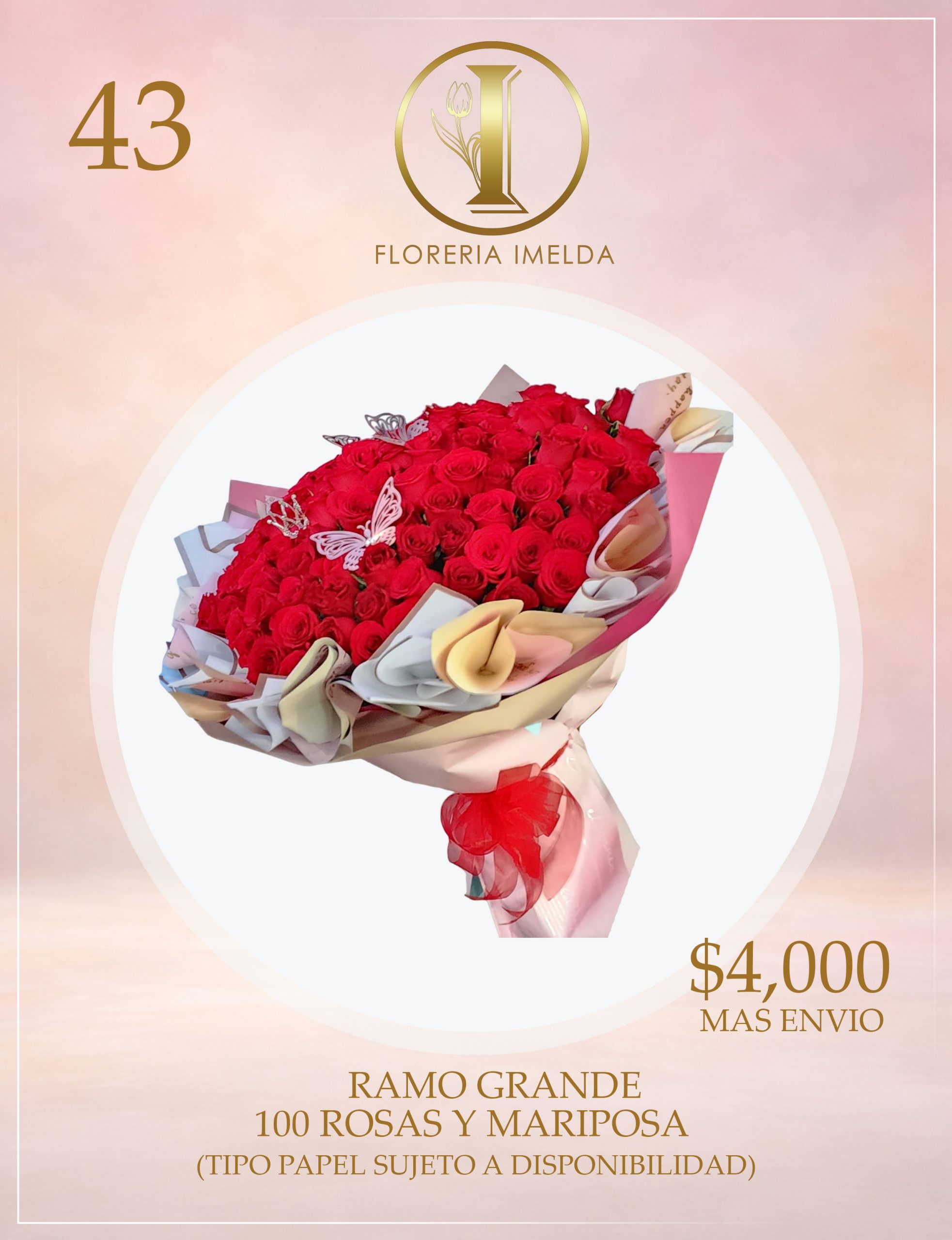 RAMO GRANDE 100 ROSAS Y MARIPOSA (TIPO PAPEL Y COMPLEMENTOS SUJETO A DISPONIBILIDAD)