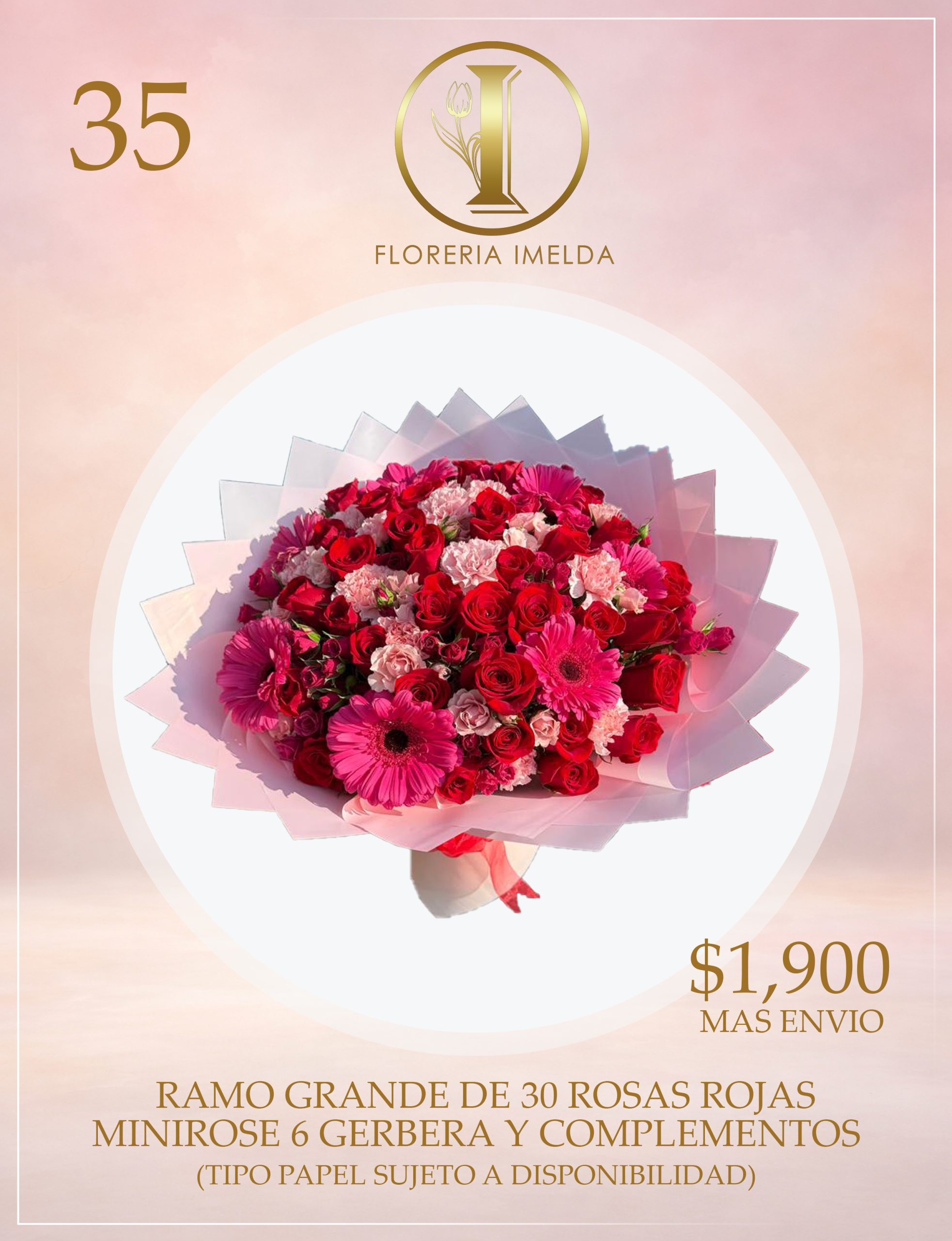 RAMO GRANDE 30 ROSAS ROJAS, MINIROSE, 6 GERBERAS Y COMPLEMENTOS (TIPO DE PAPEL Y COMPLEMENTOS SUJETO A DISPONIBILIDAD)