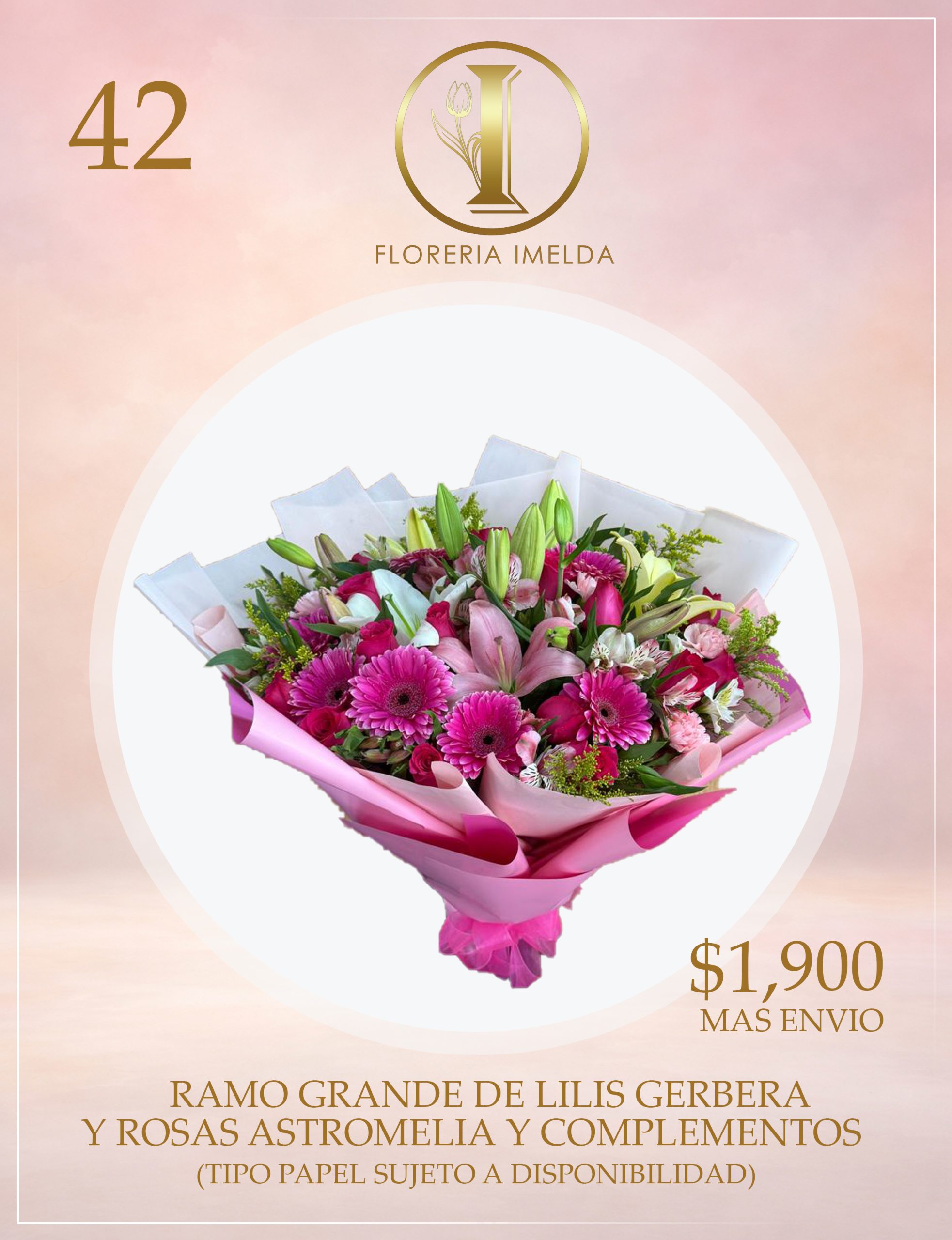 RAMO GRANDE LILIS, GERBERA, ROSAS, ASTROMELIA Y COMPLEMENTOS (TIPO PAPEL Y COMPLEMENTOS SUJETO A DISPONIBILIDAD)
